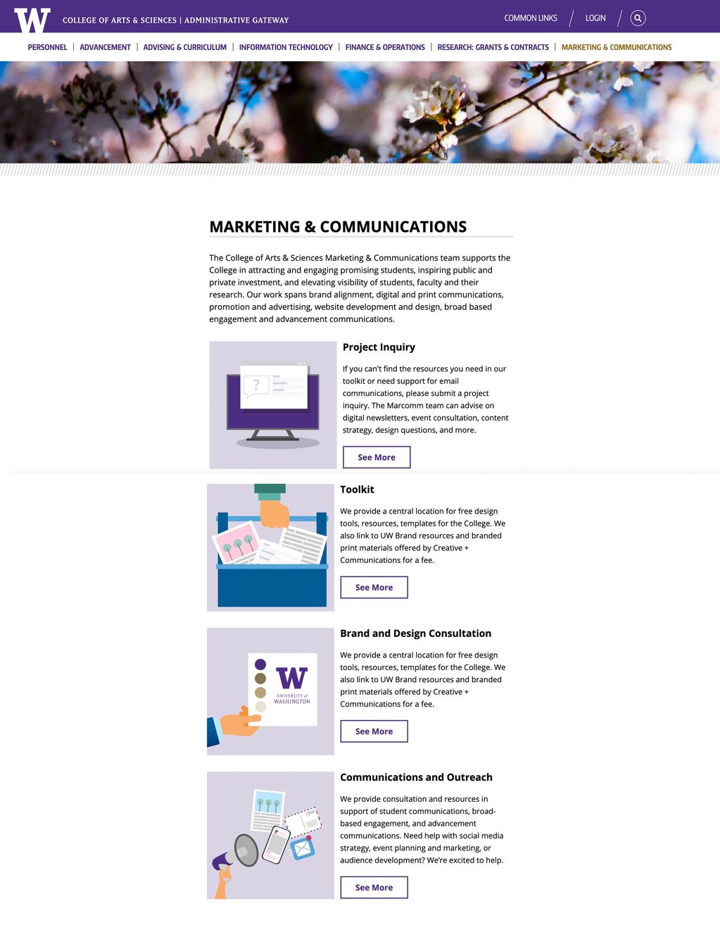 The College of Arts & Sciences is the largest College at the University of Washington. Brand and marketing efforts across 39 Arts and Sciences academic units were decentralized and inconsistent due to lack of internal communication, design resources and understanding of the benefits of brand alignment. Outreach and promotional efforts centered around student audiences produced by departmental faculty and staff were at times off brand and eclipsed the efforts of the College's marketing team. A solution was needed to centralize marketing and branding efforts. A central location for branded assets and templates resources was introduced as a way to bolster brand adoption by staff.